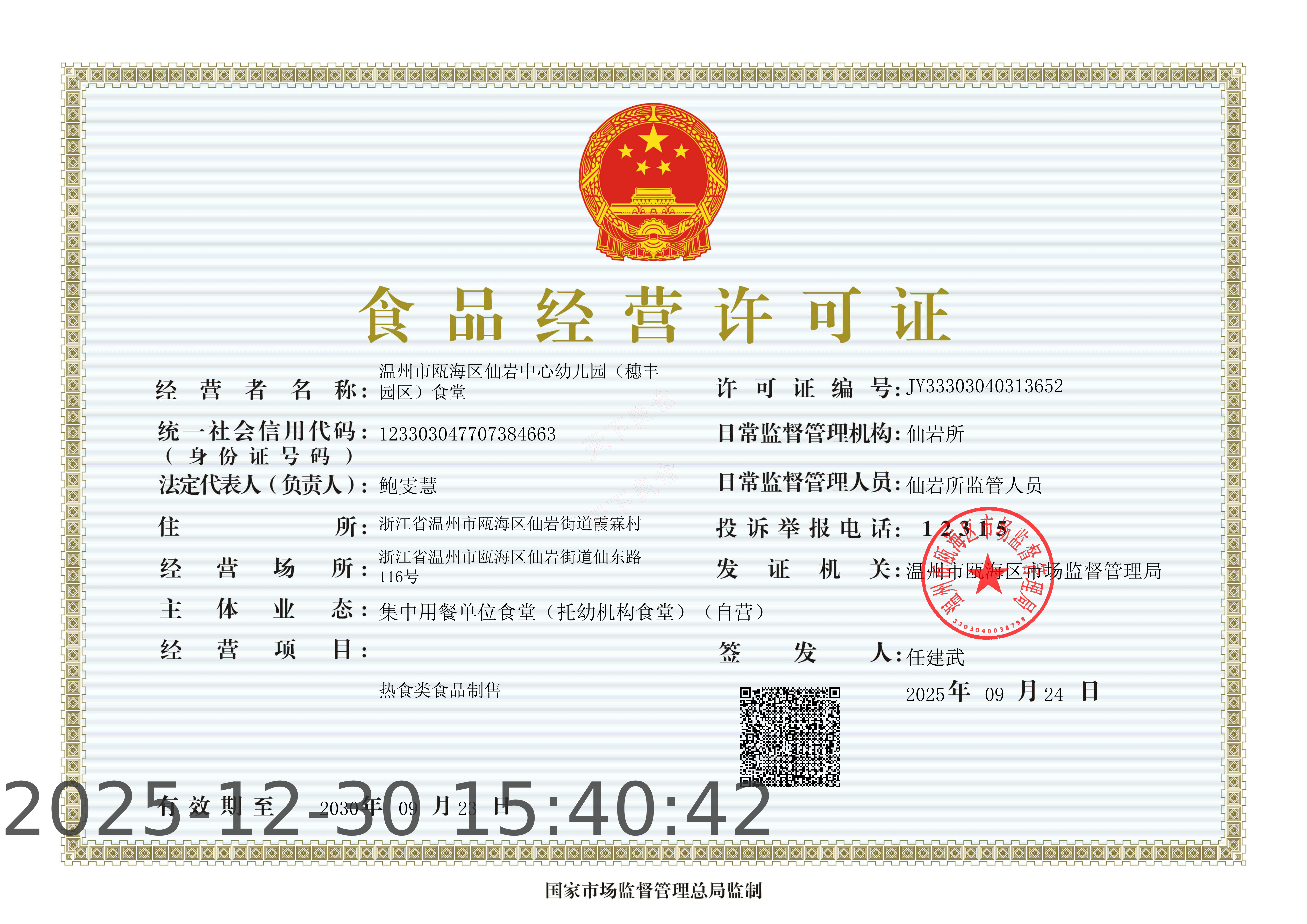 [餐饮许可证]瓯海区仙岩中心幼儿园穗丰园区(学生晚托)