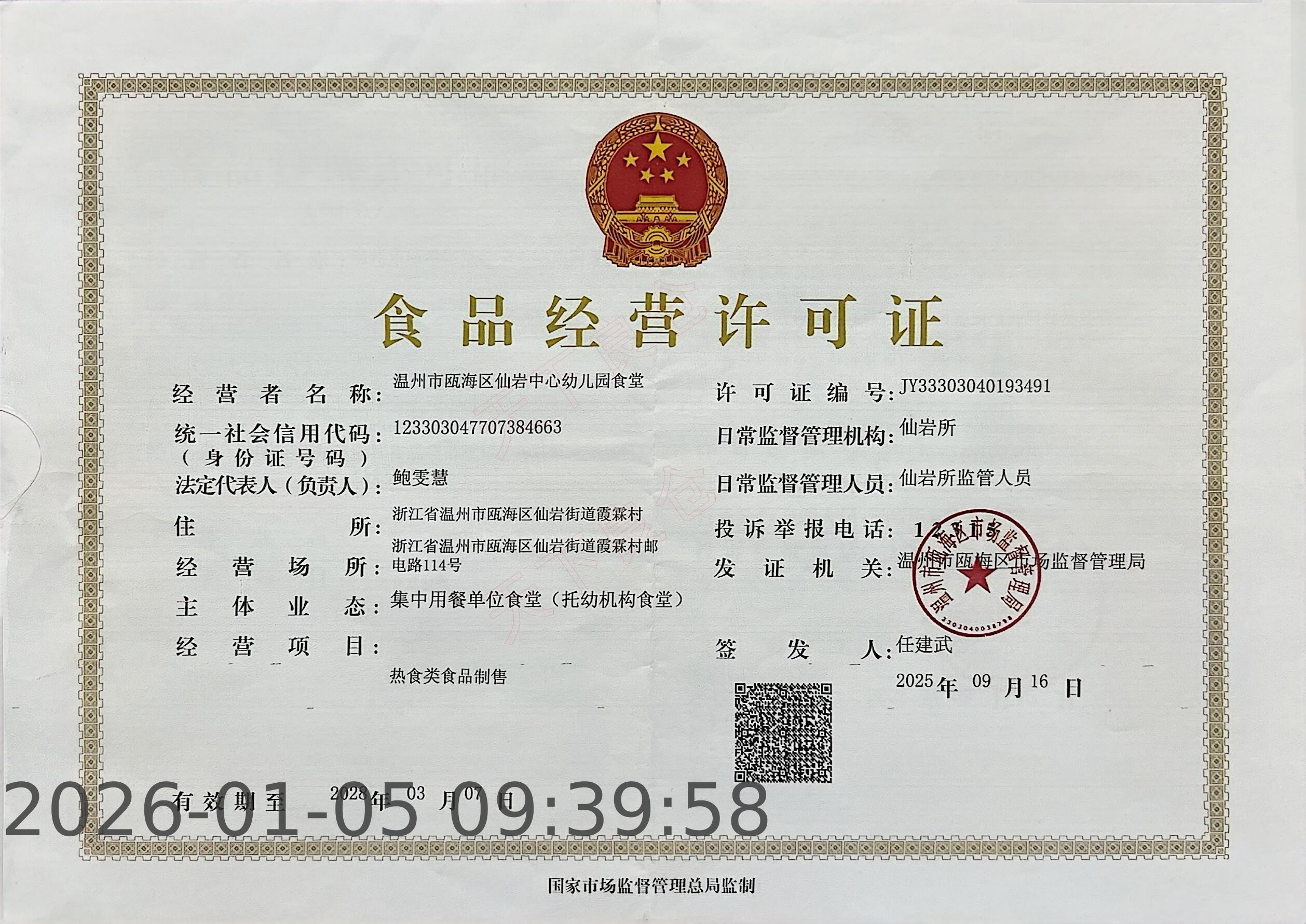 [餐饮许可证]瓯海区仙岩中心幼儿园下林园区(学生晚托)