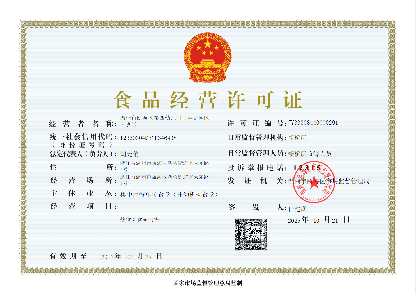 [餐饮许可证]温州市瓯海区第四幼儿园(半塘园区)食堂-学生早教